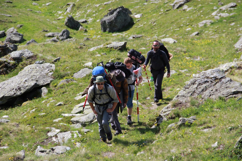 Le 7 juillet, l’équipe de terrain a rejoint le site du Mur (dit) d’Hannibal. Deux allers-retours ont été nécessaires pour porter le matériel depuis l’alpage de Boveire jusqu’aux containers de la base de recherche.