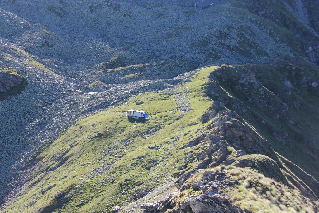 Mur (dit) d’Hannibal, juillet 2014, la base de chantier RAMHA et le site vus depuis l’arête de la Pointe de Toules ©Ramha 2014